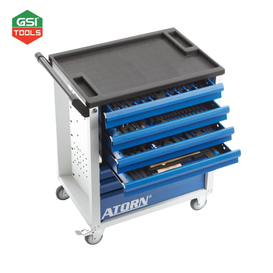 Xe đẩy dụng cụ ATORN 7 ngăn 151 chi tiết là giải pháp lưu trữ và làm việc di động tối ưu cho xưởng kỹ thuật. Thiết kế chắc chắn bằng thép tấm, tích hợp 7 khay foam chứa sẵn 151 dụng cụ chuyên dụng, giúp quản lý dụng cụ khoa học, an toàn và luôn sẵn sàng sử dụng.